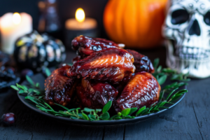 Glazed chicken wings made with soy sauce or blackberry glaze for a dark, spooky look that’ll haunt your taste buds—in a good way