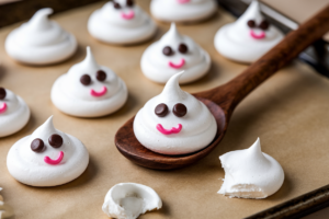 • Vegan ghosts (Aquafaba): Substitute 1/2 cup (120 ml) aquafaba for egg whites. Whip 5 minutes to soft peaks, then add 3/4 cup (150 g) superfine sugar gradually with 1/4 tsp cream of tartar.