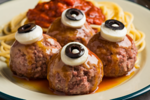 - Mediterranean vibe: Use feta crumbles inside the meatballs, oregano-forward seasoning, and kalamata olives for the pupils.