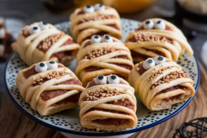 Mummy Hot Dogs – Crescent roll–wrapped hot dogs baked to look like mummies (So Cute, It’s Scary)